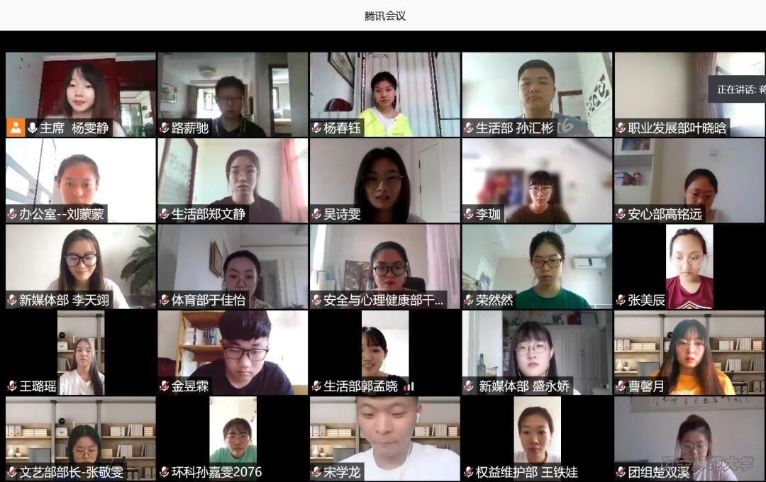 7月14日下午,欧冠官网于腾讯会议平台召开2019—2020学年第二学期团委、学生会总结大会。出席本次例会的老师有党委副书记蒋璀玢、团委书记路西昆、辅导员李智通,全体团委、学生会成员。会议由学生会主席杨雯静主持。