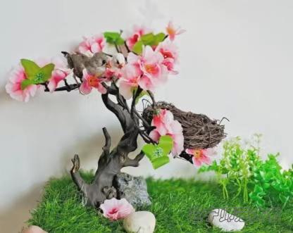作品是两只玄凤鹦鹉,黄色的玄风站在房子顶上,灰色的玄风站在秋千上,它们在清晨以相似的形态互相对望,互相打招呼,以此来体现出鹦鹉的效鸣行为。这件作品,更多的是想要和大家科普这种效鸣行为,呼吁大家以更科学的方式喜爱鸟类、爱护鸟类,一起创建和平友爱的美好家园。